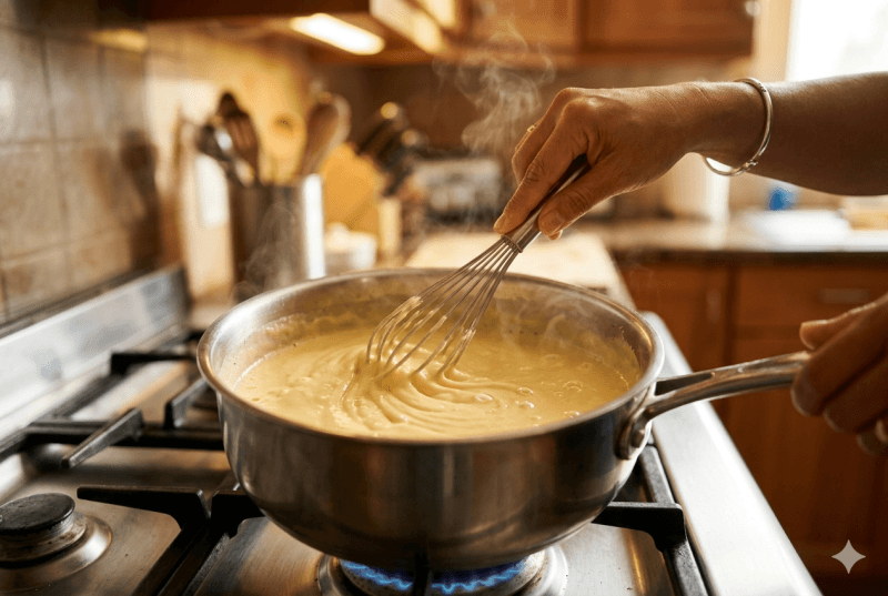 - Kembalikan campuran ke panci, masak dengan api sangat kecil sambil terus diaduk hingga suhu mencapai 82-85°C atau hingga adonan melapisi punggung sendok (nappe consistency).