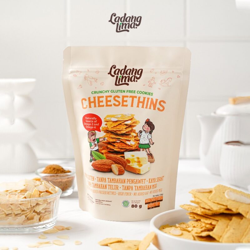 Cookies Cheesthins, cookies crispy tanpa terigu terbuat dari tepung singkong “bebas gluten” Ladang Lima, dipadu dengan taburan almond, keju, dan serpihan kelapa yang memberikan rasa gurih dan renyah, menjadikan cheesthins sebagai pilihan cookies lezat bebas gluten tang lebih sehat dan bikin hari-hari ngemilmu makin seru.