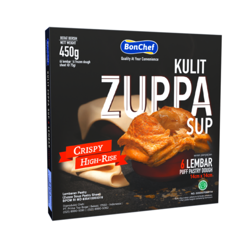 Kulit Zuppa Sup Bonchef hadir sebagai solusi praktis bagi kalian pecinta pastry khususnya zuppa sup, karena produk ini tersedia dalam bentuk adonan beku berbahan dasar puff pastry dengan isi 6 lembar berukuran 14×14 cm dan memiliki berat per lembarnya sebesar 75 gram, jadi kalian tidak perlu lagi ribet membuat adonan pastrynya serta mudah disimpan kembali.